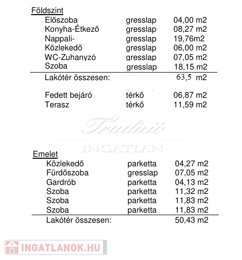 Az emelet területe összesen br. 58,73 m2, amely következő helyiségekből áll: szoba br. 15,98 m2, br. szoba 15,98 m2, szoba 11,32 m2, gardrób 4,13 m2, fürdőszoba 07,05 m2, közlekedő 4,27 m2.