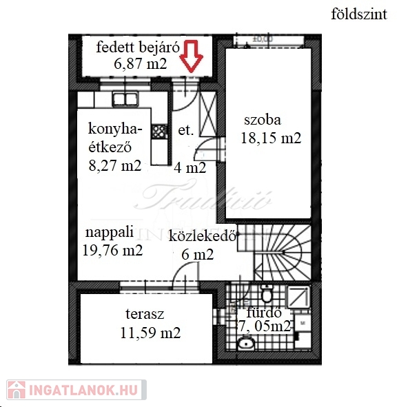 A földszint 63,5 m2, melyhez 6,87 m2-es fedett bejáró illetve 11,59 m2-es terasz is kapcsolódik. Praktikusan itt egy nagyméretű szobát is kialakítottak, ami sorházi lakásoknál ritkaságnak számít.