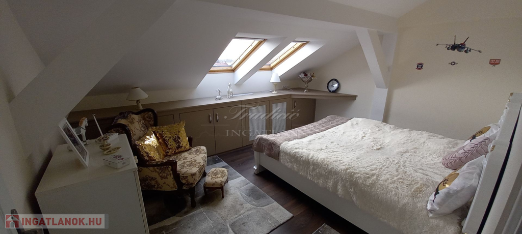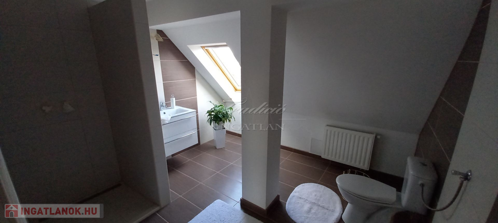 Az emeleti szint a hátsó terasz irányából is megközelíthető, itt egy étkezős konyha (még nem használt, vadonatúj konyha, felsőkategóriás gépekkel) , egy fürdőszoba, valamint 2 szoba található, amelyből az egyik szoba nappaliként a másik pedig egy saját erkéllyel rendelkező hálószobaként funkcionál. A tetőtérben további két kellemes méretű hálószoba, a háztartási helyiség és a harmadik fürdőszoba található.