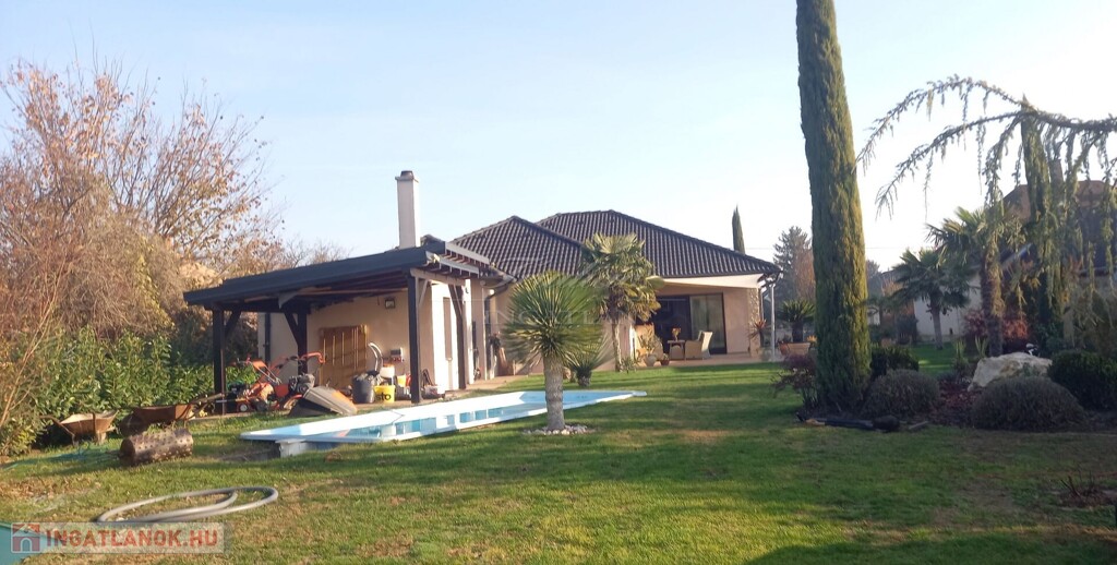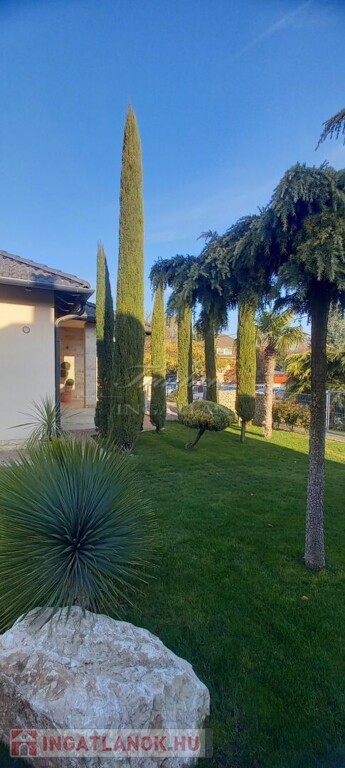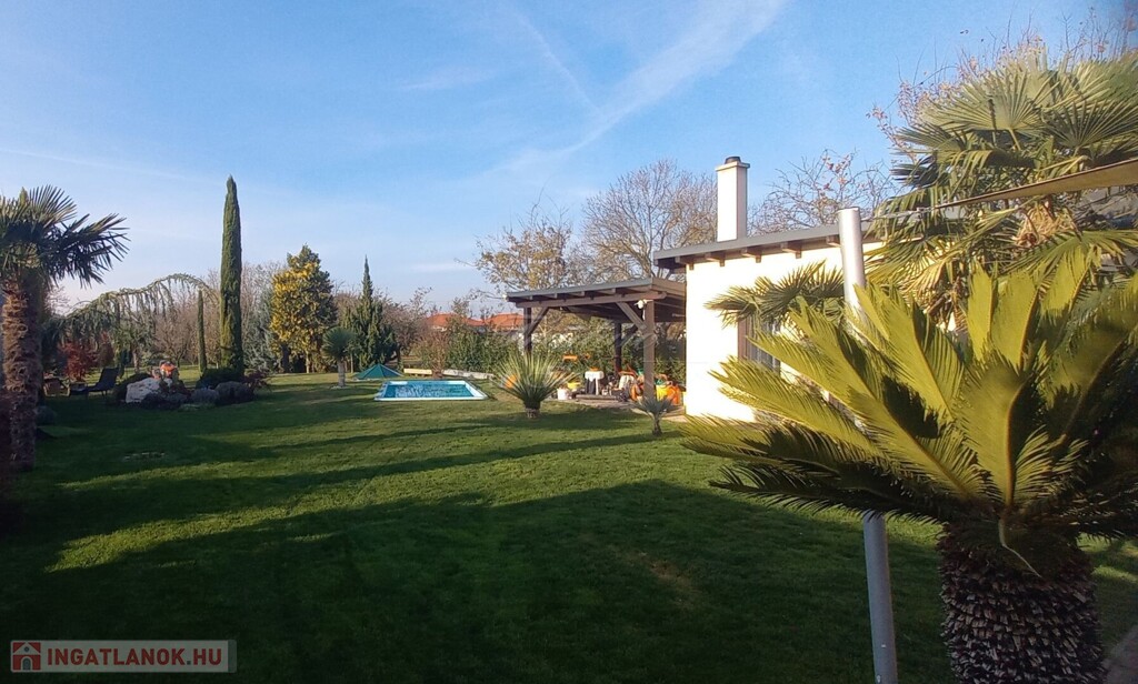 Az 1830 m2-es gyönyörűen karbantartott, parkosított, trópusi, mediterrán hangulatú telken a ház mellett egy medence, egy kazánház és egy fedett tároló is helyet kapott.