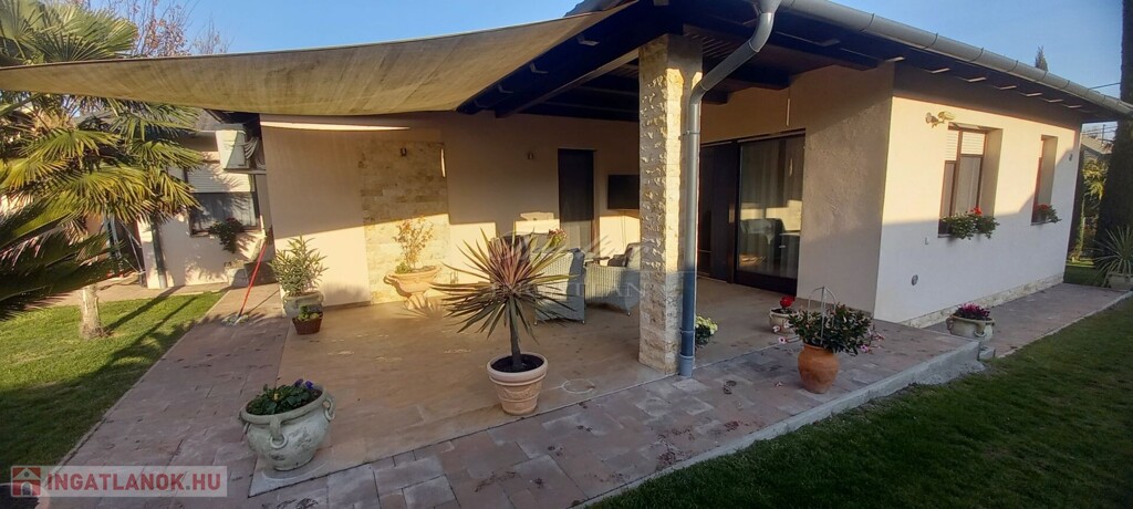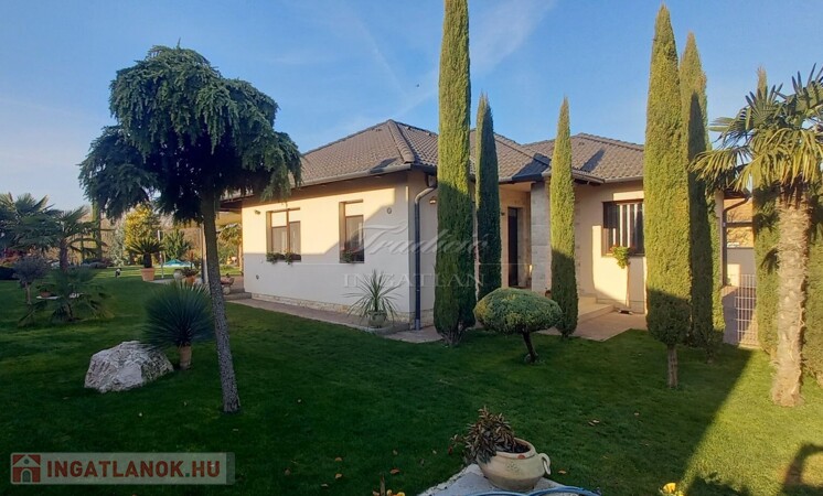 Győr kedvelt kertvárosi részén, Ménfőcsanak csendes, forgalom mentes mellékutcájában kínálom eladásra ezt a gyönyörűen parkosított 1830 m2-es telken lévő, nappali + 3 hálószobás, újszerű állapotú, 2014-ben téglából épült családi házat.