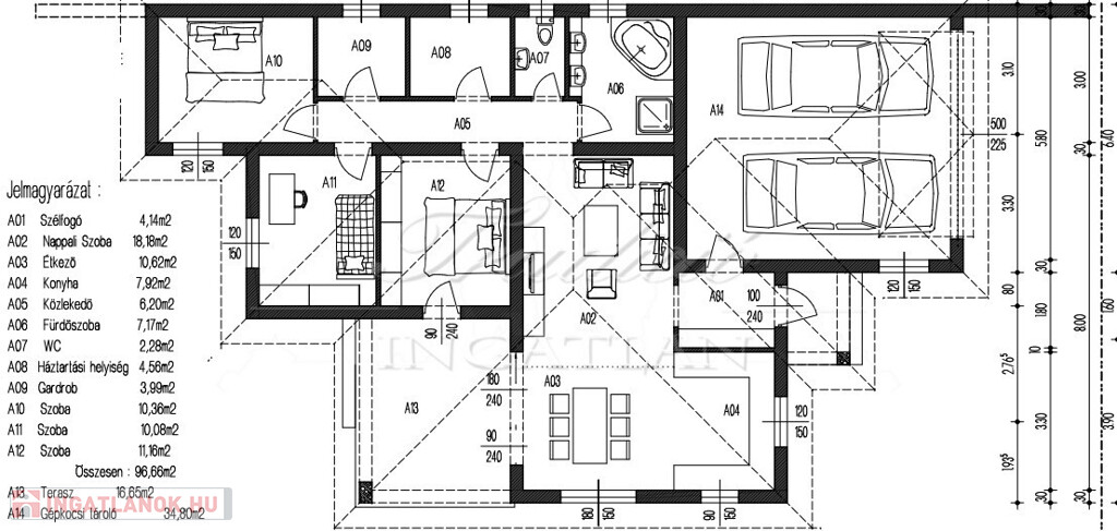 A bruttó 150 m2-es ingatlan nettó 96,66 m2-es lakótérből, 34,80 m2-es két gépjármű kényelmes parkolására alkalmas garázsból és egy fényben úszó, 18,66 m2-es teraszból áll.
