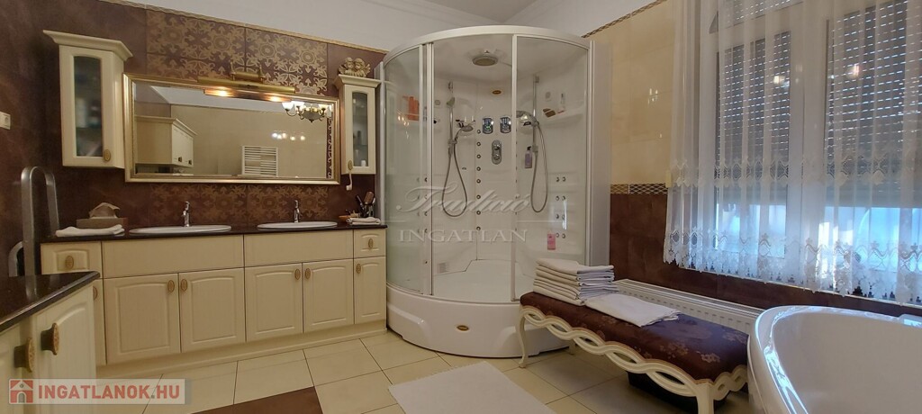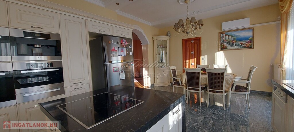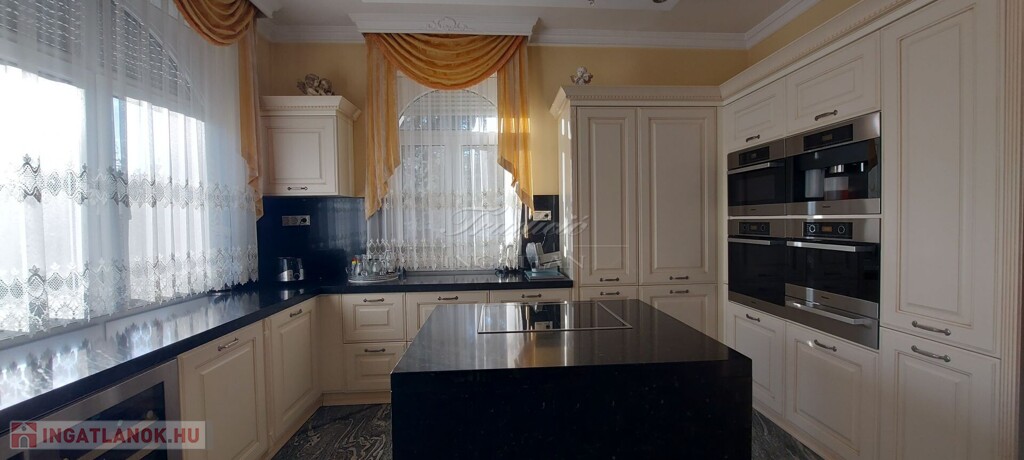 A fűtésről kondenzációs gázkazán ill. villanykazán gondoskodik radiátoros hőleadással, a nappaliban pedig egy hangulatos kandalló teremti meg az otthon melegét. A márvány és tömörfa burkolatok, valamint a tömörfa beltéri ajtók a minőségi kivitelezésről árulkodnak. A Miele beépített gépekkel felszerelt konyha a legmagasabb elvárásoknak is megfelel / sütő, főzőlap, mikro, gőzpároló, kávégép, szagelszívó, ételmelegítő fiók, mosogatógép, borhűtő /Az ingatlanhoz tartozik egy 145 m²-es, 2,9 méter belmagasságú pince, amely a lakótérből közvetlenül megközelíthető. Itt szauna, WC, moziszoba, billiárd és több pihenésre kialakított helyiség található – tökéletes tér a kikapcsolódásra vagy baráti összejövetelekre.