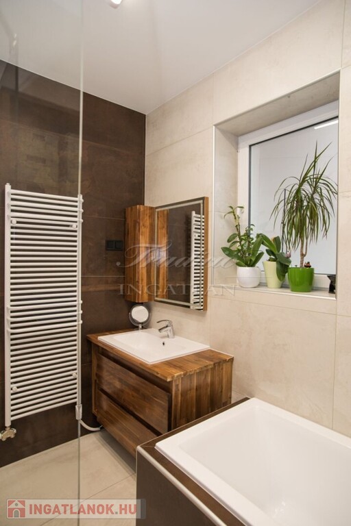 • Fürdőszoba és külön WC: mennyezetig érő greslap burkolat, kád és zuhany, elektromos padlófűtés, kombinált radiátor (elektromos vagy gázcirkó), egyedi, fűthető tükör, integrált szagelszívás.