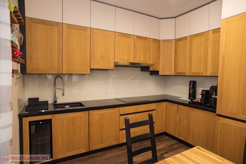 • Konyha: prémium VINYL burkolat, tömörfa konyhabútor, fekete gránit munkalap, lacobel üveg hátfal, beépített Bosch gépek, borhűtő, GREE inverteres klíma.