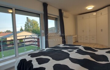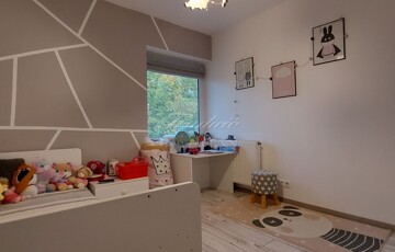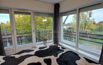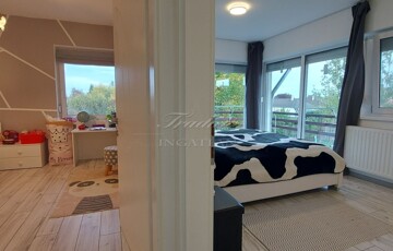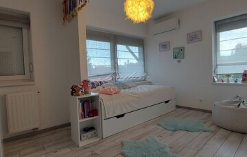A tágas, nagy üvegfelülettel rendelkező napfényes nappali közvetlenül kapcsolódik az étkezőhöz és a vele egylégterű modern-gépesített konyhához, így a családi együttlétek természetes központja a tér. Az elrendezés átgondolt: négy különnyíló hálószoba, háztartási helyiség, gardrób, valamint két fürdőszoba és külön mellékhelyiség is szolgálja a kényelmet. Az emelet teljes értékű, nem tetőtér-jellegű, így minden szoba szellős, világos és valódi élettér. A két tágas erkélyről páratlan kilátás nyílik a győrújbaráti dombokra.