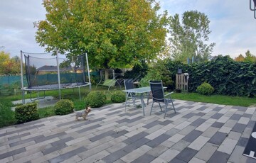 A nappalihoz 30 m²-es intim terasz kapcsolódik, a bőséges-füvesített előkertben játszóteret is felállítottak a kisgyermekeknek. A 75 méter mély fúrt kút a növényzet vízellátását biztosítja.